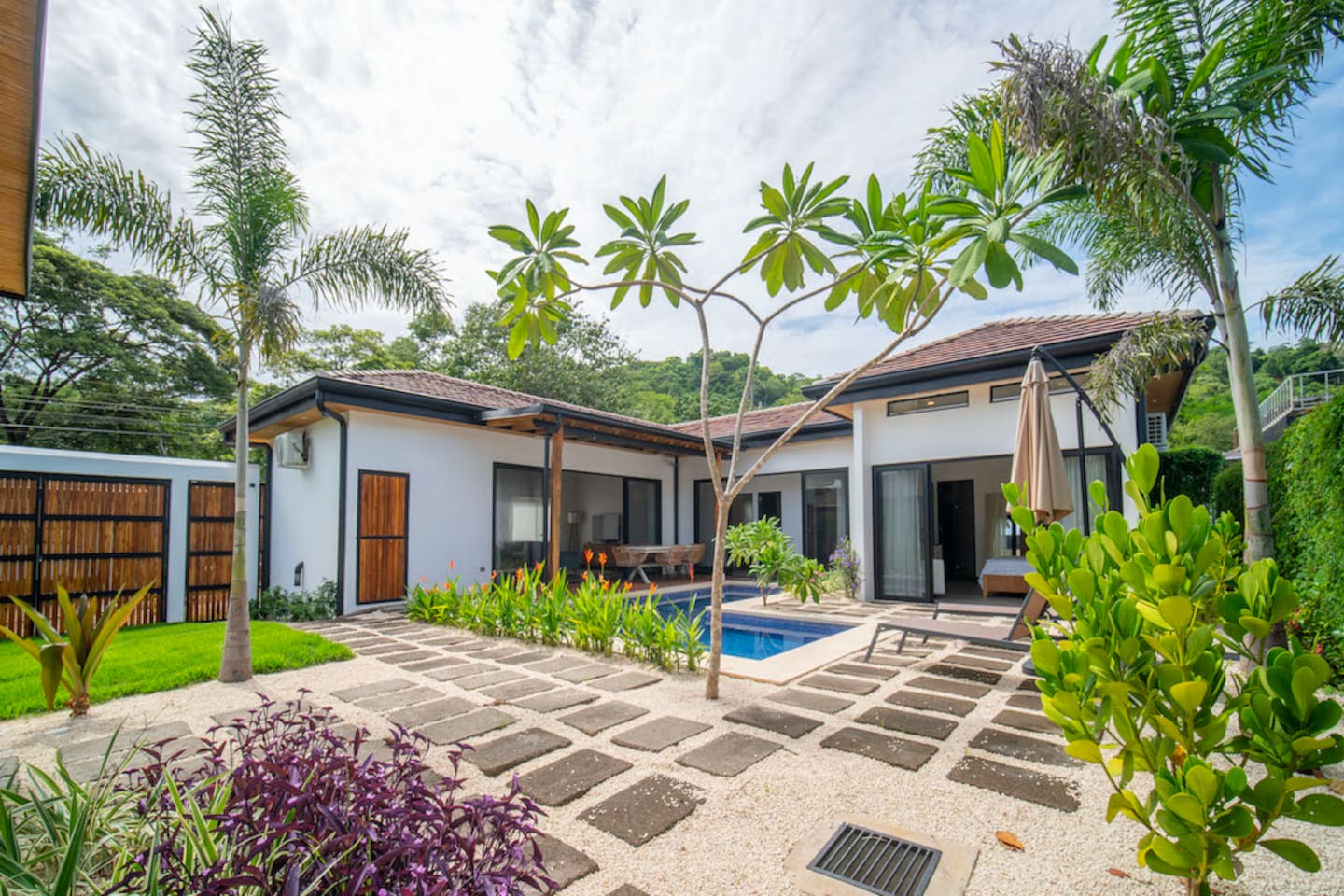 Stunning brand new 5BR home in Tamarindo’s lovely Calle Uno neighborhood with a private guest house, saltwater pool, and lush garden. The main home features a master suite, two bedrooms, living/kitchen area, teak terrace with covered pergola. Guest house includes 2BR, kitchenette, full bath. Stylish...